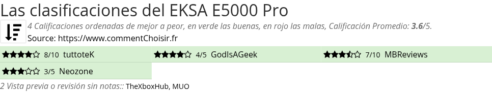 Entre estas pruebas de sitios de Internet y revistas especializadas en Videojuego, 4 dieron una calificación y obtenemos una calificación promedio de 3.6/5 para este producto EKSA.