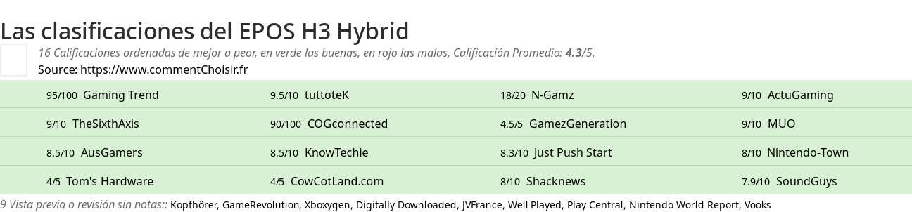 Entre estas pruebas de sitios de Internet y revistas especializadas en Auriculares, 16 dieron una calificación y obtenemos una calificación promedio de 4.2/5 para este producto EPOS.