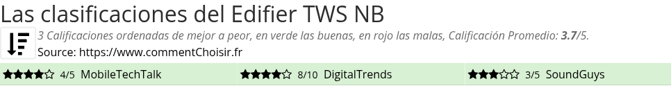 Las calificaciones de los sitios de Internet y las revistas pueden estar sesgadas, al menos con las reseñas de los clientes y los usuarios que compraron Edifier TWS NB en Amazon o Fnac, estamos seguros de que tenemos reseñas reales sobre este producto. (los enlaces a las tiendas son patrocinados)