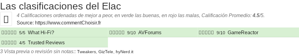Entre estas pruebas de sitios de Internet y revistas especializadas en Videojuego, 4 dieron una calificación y obtenemos una calificación promedio de 4.5/5 para este producto Elac.