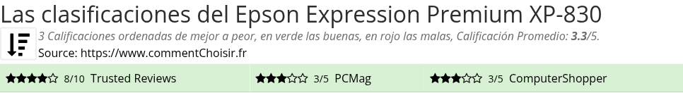 Las calificaciones de los sitios de Internet y las revistas pueden estar sesgadas, al menos con las reseñas de los clientes y los usuarios que compraron Epson Expression Premium XP-830 en Amazon o Fnac, estamos seguros de que tenemos reseñas reales sobre este producto. (los enlaces a las tiendas son patrocinados)