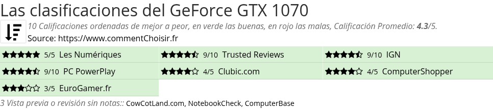 Las calificaciones de los sitios de Internet y las revistas pueden estar sesgadas, al menos con las reseñas de los clientes y los usuarios que compraron GeForce GTX 1070 en Amazon o Fnac, estamos seguros de que tenemos reseñas reales sobre este producto. (los enlaces a las tiendas son patrocinados)