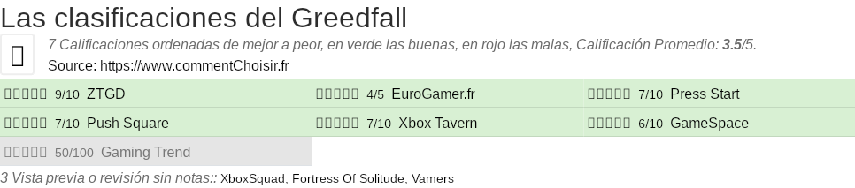 Entre estas pruebas de sitios de Internet y revistas especializadas en Videojuego, 7 dieron una calificación y obtenemos una calificación promedio de 3.5/5 para este producto Greedfall.