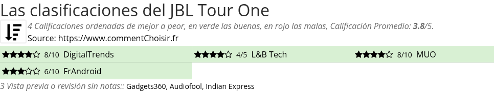 Las calificaciones de los sitios de Internet y las revistas pueden estar sesgadas, al menos con las reseñas de los clientes y los usuarios que compraron JBL Tour One en Amazon o Fnac, estamos seguros de que tenemos reseñas reales sobre este producto. (los enlaces a las tiendas son patrocinados)