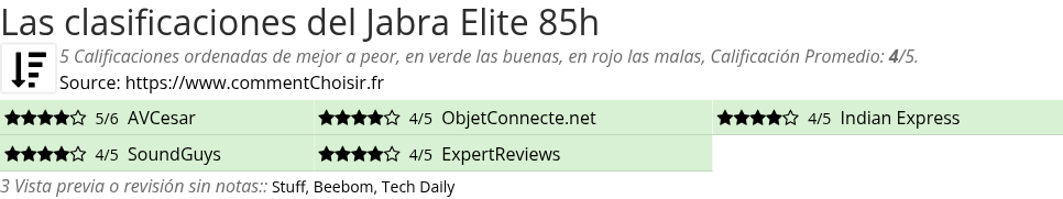 Entre estas pruebas de sitios de Internet y revistas especializadas en Auriculares, 5 dieron una calificación y obtenemos una calificación promedio de 4/5 para este producto Jabra.