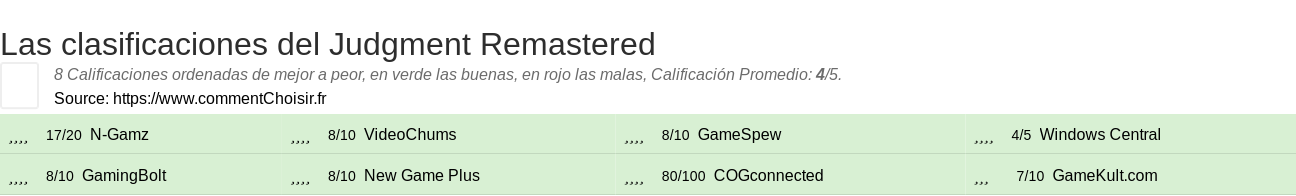 Entre estas pruebas de sitios de Internet y revistas especializadas en Videojuego, 8 dieron una calificación y obtenemos una calificación promedio de 4/5 para este producto Judgment.