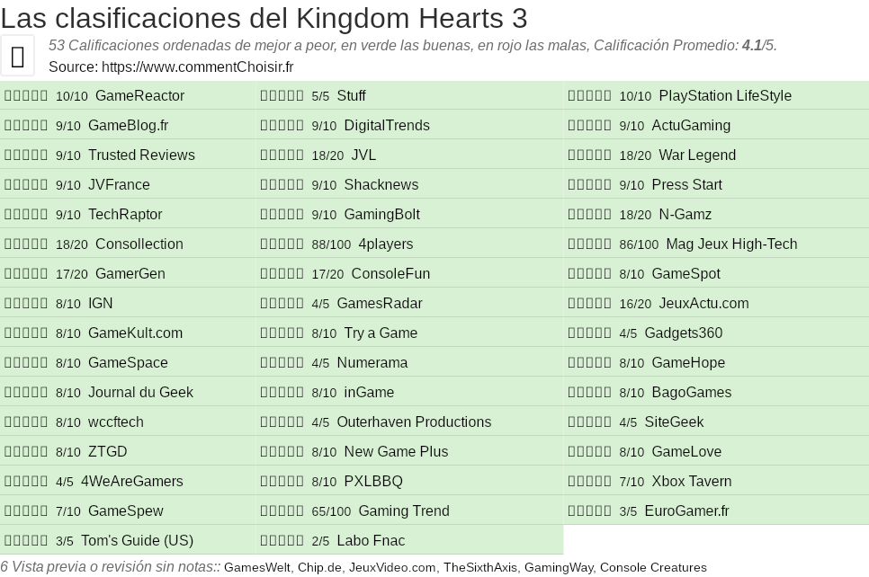 Aquí están las 60 revisiones y pruebas encontradas en el Videojuego Kingdom Hearts 3 con las 53 calificaciones y comentarios de los evaluadores en su revisión.