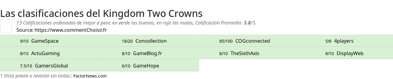 Para una mejor comparación, hemos investigado para usted las ventajas y desventajas de Kingdom Two Crowns y las notas de datos de los sitios especializados.