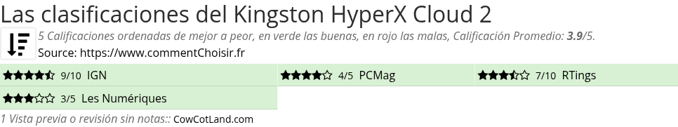 Entre estas pruebas de sitios de Internet y revistas especializadas en Auriculares, 5 dieron una calificación y obtenemos una calificación promedio de 3.9/5 para este producto Kingston.