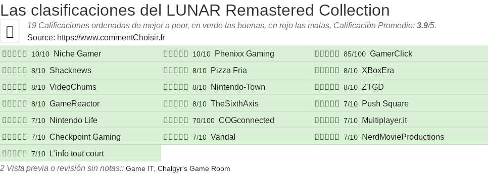 Entre estas pruebas de sitios de Internet y revistas especializadas en Videojuego, 19 dieron una calificación y obtenemos una calificación promedio de 3.9/5 para este producto LUNAR Remastered Collection.