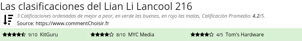 Entre estas pruebas de sitios de Internet y revistas especializadas en Componentes, 3 dieron una calificación y obtenemos una calificación promedio de 4.2/5 para este producto Lian Li.
