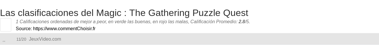 Entre estas pruebas de sitios de Internet y revistas especializadas en Videojuego, 1 dieron una calificación y obtenemos una calificación promedio de 2.8/5 para este producto Magic : The Gathering.