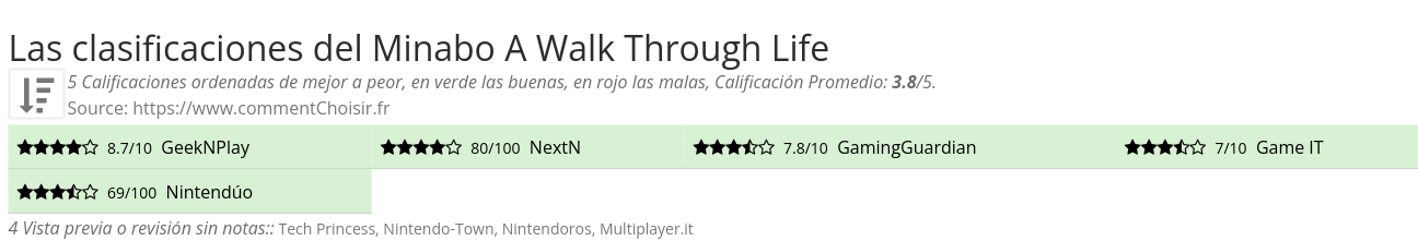 Entre estas pruebas de sitios de Internet y revistas especializadas en Videojuego, 9 dieron una calificación y obtenemos una calificación promedio de 3.4/5 para este producto Minabo.