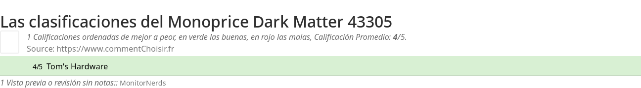 Entre estas pruebas de sitios de Internet y revistas especializadas en Monitores, 1 dieron una calificación y obtenemos una calificación promedio de 4/5 para este producto Monoprice.