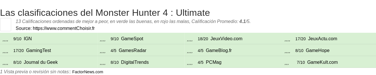 Para una mejor comparación, hemos investigado para usted las ventajas y desventajas de Monster Hunter 4 : Ultimate y las notas de datos de los sitios especializados.