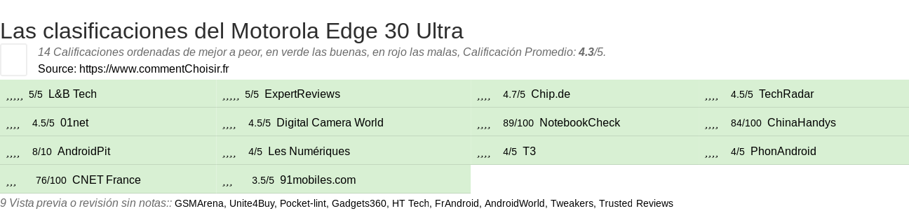 Las calificaciones de los sitios de Internet y las revistas pueden estar sesgadas, al menos con las reseñas de los clientes y los usuarios que compraron Motorola Edge 30 Ultra en Amazon o Fnac, estamos seguros de que tenemos reseñas reales sobre este producto. (los enlaces a las tiendas son patrocinados)