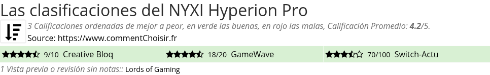 Entre estas pruebas de sitios de Internet y revistas especializadas en Accesorios Videoconsolas, 3 dieron una calificación y obtenemos una calificación promedio de 4.2/5 para este producto NYXI.