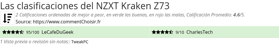 Aquí están las 3 revisiones y pruebas encontradas en el Componentes NZXT Kraken Z73 con las 2 calificaciones y comentarios de los evaluadores en su revisión.