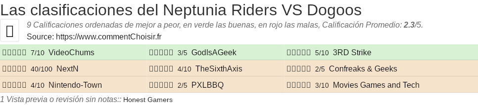Entre estas pruebas de sitios de Internet y revistas especializadas en Videojuego, 9 dieron una calificación y obtenemos una calificación promedio de 2.3/5 para este producto Neptunia Riders.