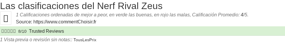 Las calificaciones de los sitios de Internet y las revistas pueden estar sesgadas, al menos con las reseñas de los clientes y los usuarios que compraron Nerf Rival Zeus en Amazon o Fnac, estamos seguros de que tenemos reseñas reales sobre este producto. (los enlaces a las tiendas son patrocinados)