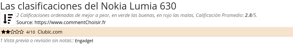 Entre estas pruebas de sitios de Internet y revistas especializadas en Smartphones, 2 dieron una calificación y obtenemos una calificación promedio de 2.8/5 para este producto Nokia.