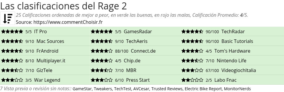 Las calificaciones de los sitios de Internet y las revistas pueden estar sesgadas, al menos con las reseñas de los clientes y los usuarios que compraron Rage 2 en Amazon o Fnac, estamos seguros de que tenemos reseñas reales sobre este producto. (los enlaces a las tiendas son patrocinados)