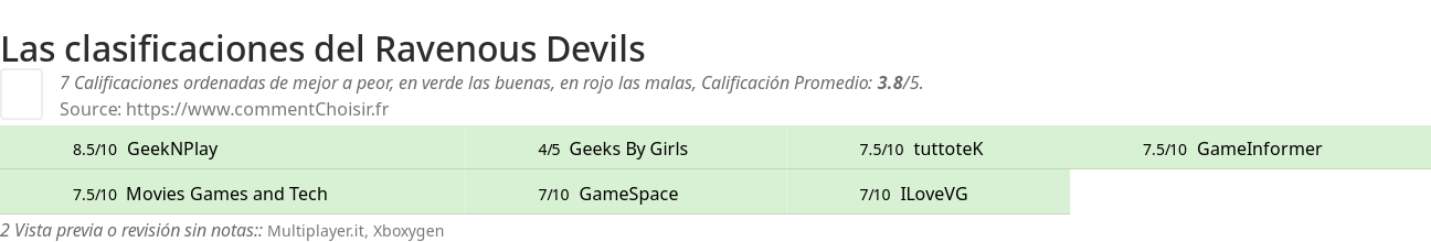 Entre estas pruebas de sitios de Internet y revistas especializadas en Videojuego, 7 dieron una calificación y obtenemos una calificación promedio de 3.6/5 para este producto Ravenous Devils.