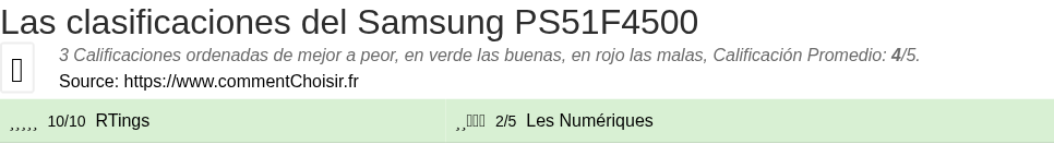 Las calificaciones de los sitios de Internet y las revistas pueden estar sesgadas, al menos con las reseñas de los clientes y los usuarios que compraron Samsung PS51F4500 en Amazon o Fnac, estamos seguros de que tenemos reseñas reales sobre este producto. (los enlaces a las tiendas son patrocinados)