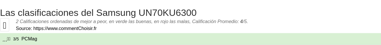 Aquí están las 2 revisiones y pruebas encontradas en el Televisores Samsung UN70KU6300 con las 2 calificaciones y comentarios de los evaluadores en su revisión.
