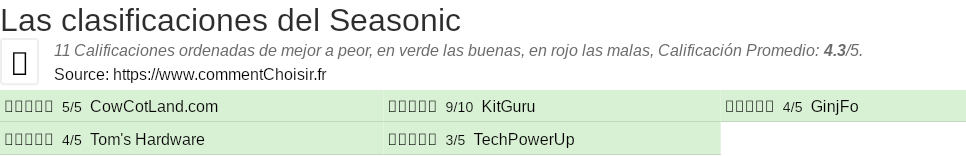 Entre estas pruebas de sitios de Internet y revistas especializadas en Componentes, 11 dieron una calificación y obtenemos una calificación promedio de 4.3/5 para este producto Seasonic.