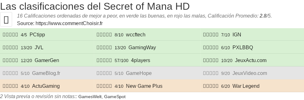 Entre estas pruebas de sitios de Internet y revistas especializadas en Videojuego, 16 dieron una calificación y obtenemos una calificación promedio de 2.8/5 para este producto Secret of Mana.