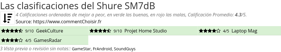Entre estas pruebas de sitios de Internet y revistas especializadas en Juegos y Streaming, 4 dieron una calificación y obtenemos una calificación promedio de 4.3/5 para este producto Shure.