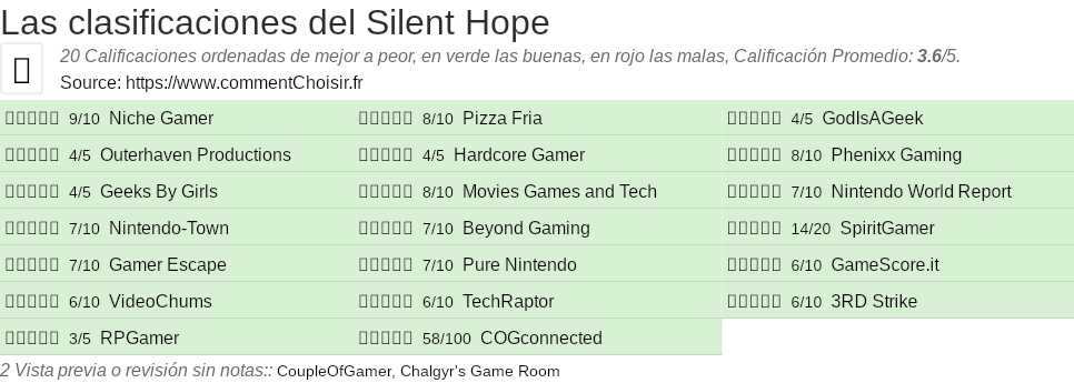 Entre estas pruebas de sitios de Internet y revistas especializadas en Videojuego, 20 dieron una calificación y obtenemos una calificación promedio de 3.6/5 para este producto Silent Hope.