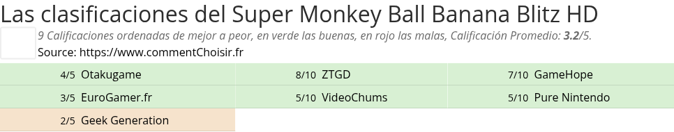 Entre estas pruebas de sitios de Internet y revistas especializadas en Videojuego, 9 dieron una calificación y obtenemos una calificación promedio de 3.2/5 para este producto Super Monkey Ball.
