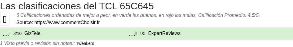 Entre estas pruebas de sitios de Internet y revistas especializadas en Televisores, 6 dieron una calificación y obtenemos una calificación promedio de 4.5/5 para este producto TCL .