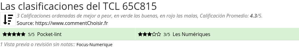 Las calificaciones de los sitios de Internet y las revistas pueden estar sesgadas, al menos con las reseñas de los clientes y los usuarios que compraron TCL 65C815 en Amazon o Fnac, estamos seguros de que tenemos reseñas reales sobre este producto. (los enlaces a las tiendas son patrocinados)