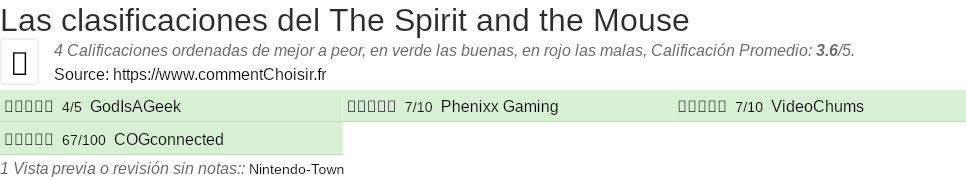 Entre estas pruebas de sitios de Internet y revistas especializadas en Videojuego, 4 dieron una calificación y obtenemos una calificación promedio de 3.6/5 para este producto The Spirit and the Mouse.