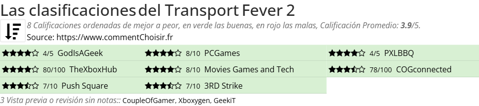 Entre estas pruebas de sitios de Internet y revistas especializadas en Videojuego, 8 dieron una calificación y obtenemos una calificación promedio de 3.9/5 para este producto Transport Fever.