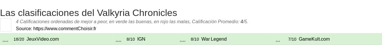 Entre estas pruebas de sitios de Internet y revistas especializadas en Videojuego, 4 dieron una calificación y obtenemos una calificación promedio de 4/5 para este producto Valkyria Chronicles.