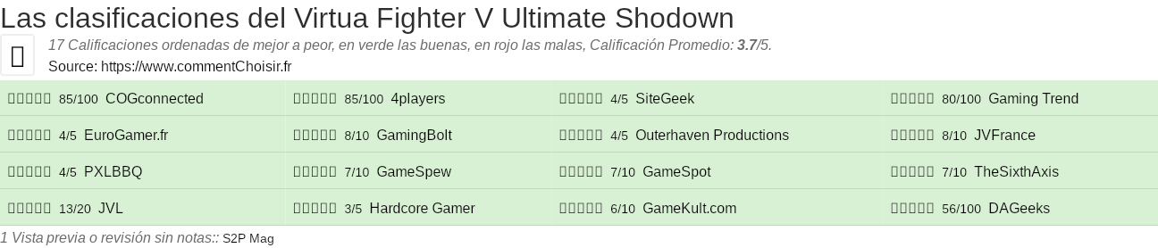 Las calificaciones de los sitios de Internet y las revistas pueden estar sesgadas, al menos con las reseñas de los clientes y los usuarios que compraron Virtua Fighter V Ultimate Shodown en Amazon o Fnac, estamos seguros de que tenemos reseñas reales sobre este producto. (los enlaces a las tiendas son patrocinados)