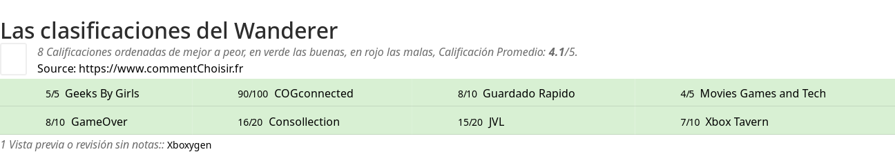 Entre estas pruebas de sitios de Internet y revistas especializadas en Videojuego, 5 dieron una calificación y obtenemos una calificación promedio de 4.3/5 para este producto Wanderer.