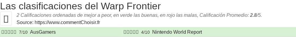Aquí están las 2 revisiones y pruebas encontradas en el Videojuego Warp Frontier con las 2 calificaciones y comentarios de los evaluadores en su revisión.