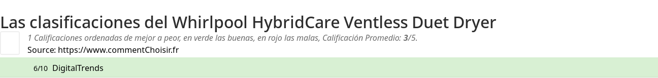 Entre estas pruebas de sitios de Internet y revistas especializadas en Secadora de ropa, 1 dieron una calificación y obtenemos una calificación promedio de 3/5 para este producto Whirlpool.