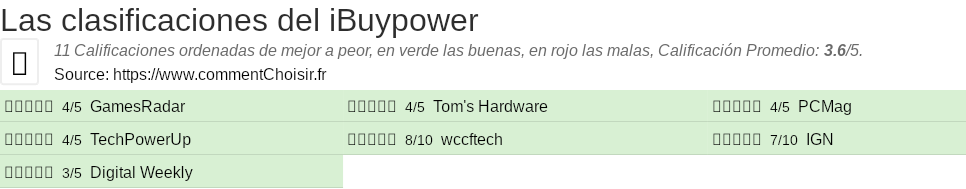 Entre estas pruebas de sitios de Internet y revistas especializadas en Ordenador, 11 dieron una calificación y obtenemos una calificación promedio de 3.6/5 para este producto iBuypower.