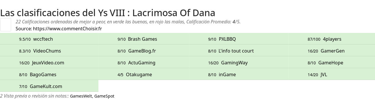 Entre estas pruebas de sitios de Internet y revistas especializadas en Videojuego, 22 dieron una calificación y obtenemos una calificación promedio de 4/5 para este producto Ys.