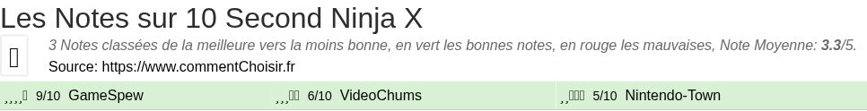 Les notes des sites et magazines internet peuvent etre peut-etre biaisés, au moins avec les avis client et des utilisateurs qui ont acheté 10 Second Ninja X sur amazon ou la fnac, on est sur d'avoir de vrais critiques sur ce produit. (les liens vers les magasins sont sponsorisés). Pour les jeux et quand cela est est possible nous listons aussi les notes moyennes sur les plateformes de consommateurs (comme IGDB)