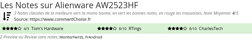 Les notes des sites et magazines internet peuvent etre peut-etre biaisés, au moins avec les avis client et des utilisateurs qui ont acheté Alienware AW2523HF sur amazon ou la fnac, on est sur d'avoir de vrais critiques sur ce produit. (les liens vers les magasins sont sponsorisés).