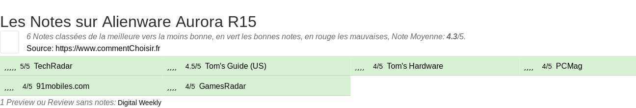 Les notes des sites et magazines internet peuvent etre peut-etre biaisés, au moins avec les avis client et des utilisateurs qui ont acheté Alienware Aurora R15 sur amazon ou la fnac, on est sur d'avoir de vrais critiques sur ce produit. (les liens vers les magasins sont sponsorisés).