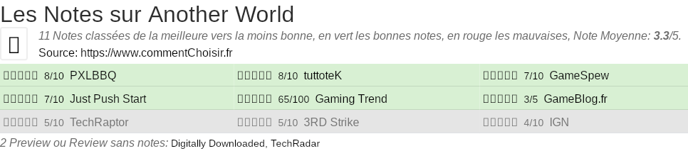 Parmis ces tests des sites & magazines internet spécialisés dans les Jeux, 11 ont donné une note et on obtient une note moyenne de 3.3/5 pour ce produit de Another World.