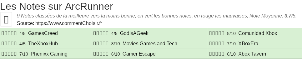 Parmis ces tests des sites & magazines internet spécialisés dans les Jeux, 9 ont donné une note et on obtient une note moyenne de 3.7/5 pour ce produit de ArcRunner.